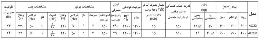 مشخصات فنی و ابعاد دستگاه کولر آبی آبسال AC33K