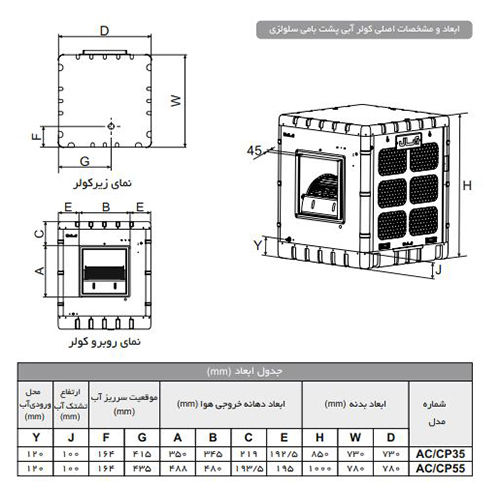 ابعاد کولر آبی آبسال پشت بامی مدل ACCP35R