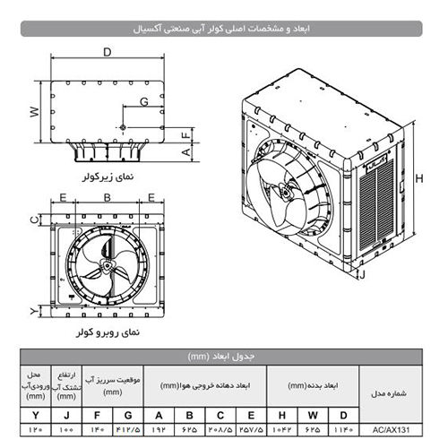 ابعاد کولر آبی صنعتی آبسال آکسیال مدل AC-AX131